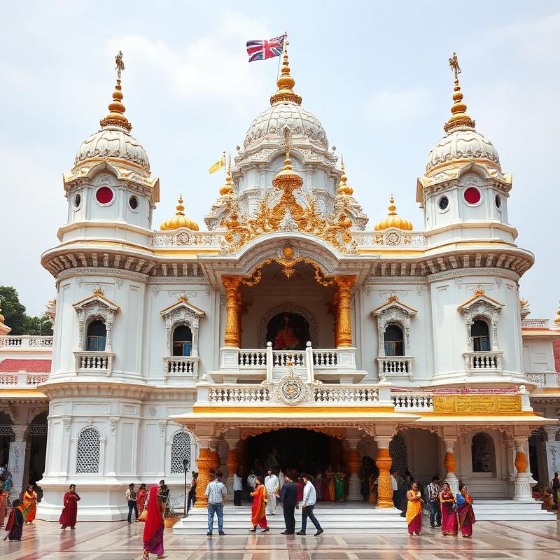 A stunning white marble temple showcasing the divine love of Radha Krishna, illuminated beautifully at night.